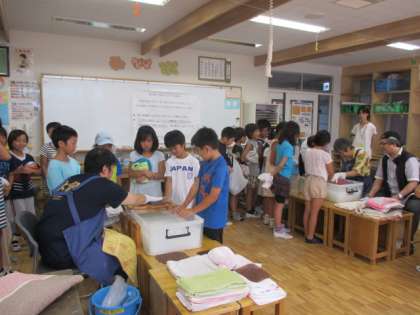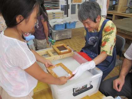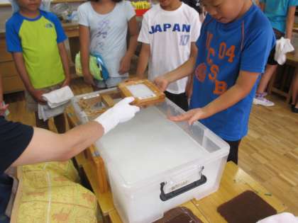 紙すきは希望者がたくさんで2回行われました。パルプと牛乳パックを砕いたものを使って紙をすきます。たくさんの子がみんなのやる様子を見て学びながら取り組んで、すてきな葉書ができました。