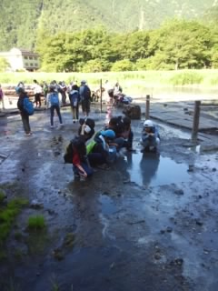 ハイキングのスタートです。宿の近くに源泉があります。硫黄の匂いがします。一人熱のために宿で休んでいます。安生先生がお世話をしています。