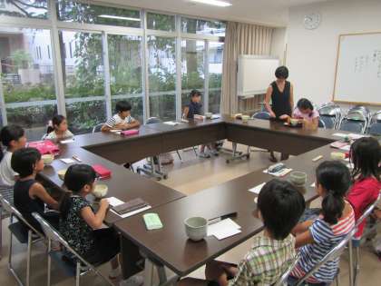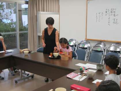 8月26日は「KID茶道きょうさい」です。会議室に姿勢よく子供たちが座っています。茶道は姿勢も大事です。先生に教えられてお抹茶を立てていますが、味はどうだったのでしょうか。茶道にはお菓子がつくのでお抹茶の味がちょうどよくなるようです。〈校長 箭内〉