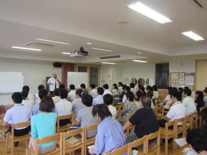 8月28日は学び舎3校合同特別支援研修会でした。3校の先生方が集まり、京西小の多目的室は満員です。講師の先生は18歳の適応に向けて等々ポイントを絞ったお話をしてくれました。共通のお話が聞けるのはとても良いことです。〈校長 箭内〉