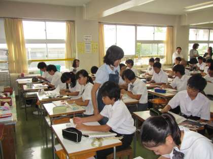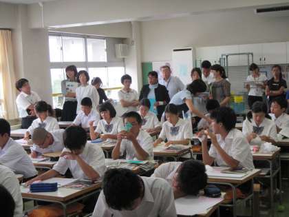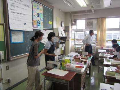 研究授業は3教科やりました。理科の次は美術です。「絵文字がしゃべりだす」〜絵と文字を結びつけた楽しい絵文字の製作〜です。先生は中濱先生です。半立体になるように材料の種類、使用する箇所、効果的な使用法を色と形を考えながら製作します。卒業生が熱心に学んでいる姿を見るのは嬉しいものです。〈校長 箭内〉