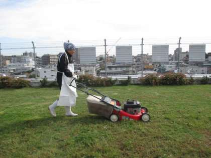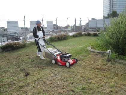 屋上庭園の芝が伸びてしまったので、校長先生や主事さんたちが芝刈りをしています。芝刈り機を使う前に長い芝を草刈機で切ってから、芝刈り機を使います。なかなか大変な作業で、刈った芝を集めて捨てるのも大仕事です。