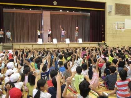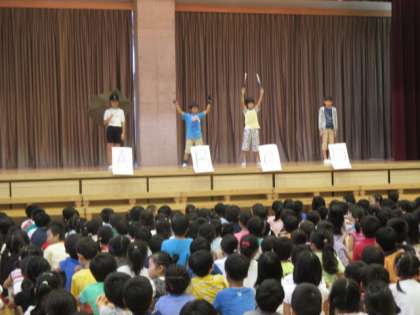今日の児童集会は「まちがいさがし」ゲームでした。集会委員がいろいろなものを持ってポーズをとり、幕が閉まって持っているものやポーズが変わったかどうかをみんなが当てるゲームです。集会委員が楽しんで取り組んでいる様子が伺え、子どもたちも楽しくゲームに参加していました。工夫がたくさん見られた集会でした。
