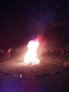 今日の最後イベント、キャンプファイヤー、炎が天高く舞い上がります。まずは京西ソーランです。空は満天の星ですねん