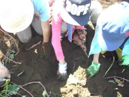 桜新町にある秋山農園にさつまいもほりに行ってきました。今年は、夏の間の天気がよく、さつまいもはかなり大きく育っていました。子どもたちは一生懸命土の中をさがし、大きなさつまいもを見つけると大きな歓声を上げていました。