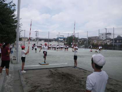 6年生は連合運動会に向けて、練習をしています。走り幅跳び、ハードル走、走り高跳び、百メートル走、リレー、長縄等の種目があり、子供たちはどれか一つに挑戦します。リレーは選抜となります。