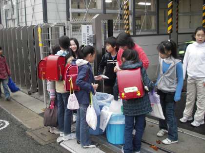 登校の時にゴミをひろってこようという取り組みなのです。ゴミを挟むトングを持ってゴミを拾っている人もいました。タバコの吸い殻がいっぱいです。という人もいました。みんなが拾ってきたゴミは門のところできちんと分別してポリバケツに集めました。