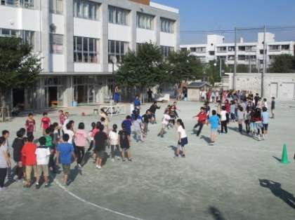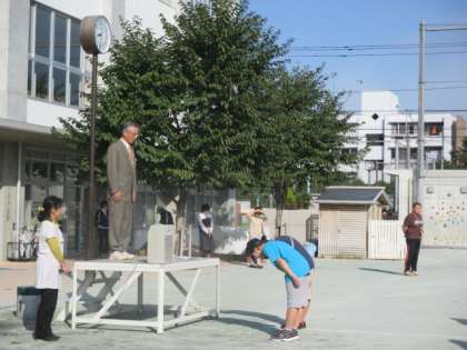 今日の朝会は珍しく校庭で行いました。6年生代表が全校の前に立って校長先生と朝の挨拶をしたあと、今日は今週行われる連合運動会に参加する6年生の壮行会をしました。