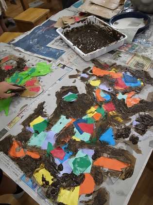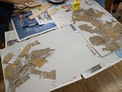 4年生の図工では、段ボールを使った貼り絵「大きな木」をつくっています。「まほうの力をもった大きな木」は、どんな木なのかな…想像をふくらませて表します。