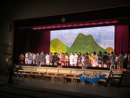明日はワンダーランド児童鑑賞日、土曜日は保護者の方々の鑑賞日です。いよいよ本番が近付きました。今日はリハーサルです。本番同様に衣装をつけて演技をします。写真屋さんが来て各学年の演技を撮ってくれています。写真は4年生の最後の場面と6年生の最初の場面です。土曜日を期待してください。多くの保護者の方々の参観をお待ちしています。〈校長 箭内〉