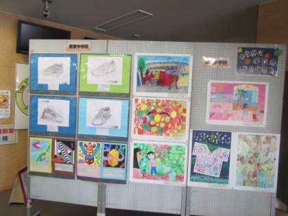 体育館の入口に用賀小学校、用賀中学校の児童・生徒の作品が掲示されています。ようがの学び舎で取り組んでいる3校作品交流です。是非、ご覧になってください。
