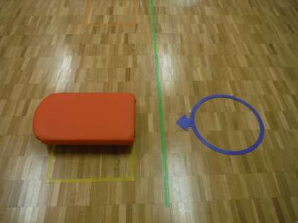 運動の授業の中で、「サーキット」に取り組んでいます。(他に、身体模倣や長縄、コーディネーショントレーニングなどいろいろな内容に取り組んでいます。)サーキットはいくつかの運動を順番に体験しながら一定の時間動き続けます。体をなめらかに動かしたり、全身の筋肉を養ったりすることがねらいです。ゴムひもに触れずにくぐったり、二本橋の上を渡ったり、一つ一つは難しくはありません。子どもたちは楽しみながら体を動かしています。