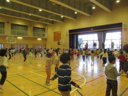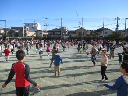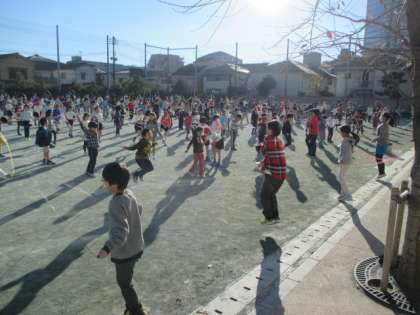 二重跳びなど難しい跳び方も入っています。寒い朝でしたが、音楽が終わるとみんな頬を真っ赤にして温かくなったようです。「子どもは風の子」ですね。