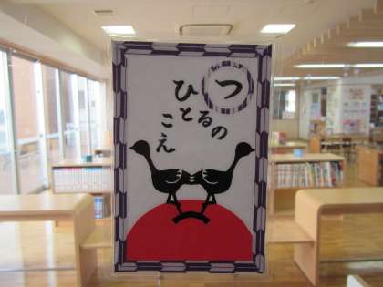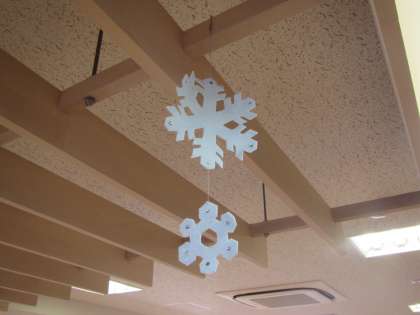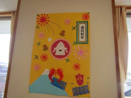 1月8日、始業式の日にはもう図書室の装飾はお正月バージョンになっていました。片側のガラス窓にはカルタが、もう一方のガラス窓にはかわいい雪だるまが飾られています。図書室の中には雪の結晶が舞っています。壁には謹賀新年の素敵な飾りと手編みの装飾です。季節感が味わえる、とても素敵な図書館なのです。今年もたくさん本に触れ合ってください。〈校長 箭内〉