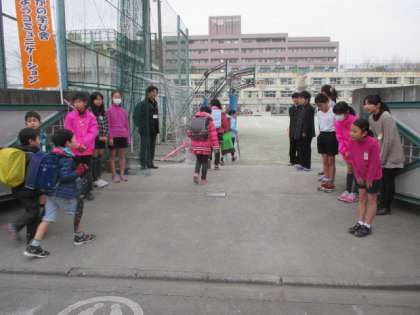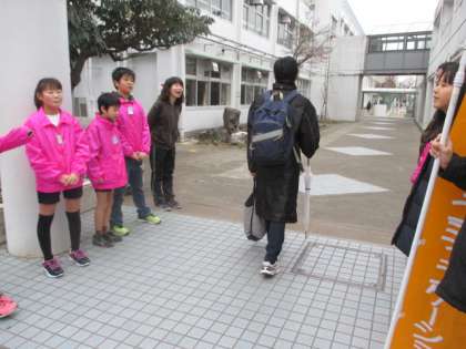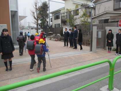 用賀中学校の生徒は、京西小と用賀小にあいさつ運動に出かけています。それぞれの小学生(代表委員)は用賀中学校であいさつ運動に取り組んでいます。
