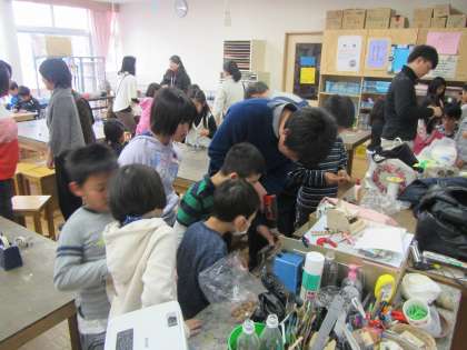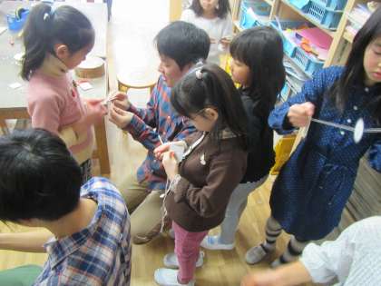 1月の「このゆびとまれ」は独楽作りです。テープを巻いて作ります。ドングリごまも作りました。一生懸命に回そうとしているのはぶんぶんごまです。回すのが意外と難しいのです。新年最初のこのゆびですが、準備の段階から保護者、PTA役員の方々、先生たちが集まり、賑やかにスタートしました。〈校長 箭内〉