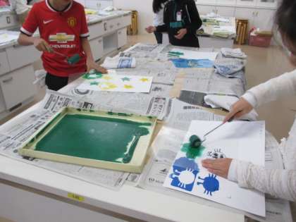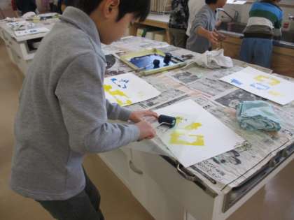 2年生の図工を見ました。ポリエチレンの板を好きな生き物の形に切り抜いて、ローラーで色を塗ります。一つの形をいろいろな色でローラーをかけて作品を作っています。ローラをかけるのが楽しそうで、みんな黙々と作業に取り組んでいます。