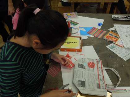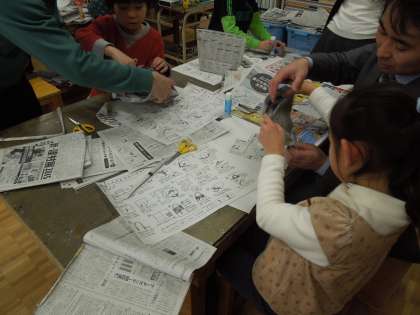 子どもたちがそれぞれ持ってきた新聞紙を使って、エコバックを作りました。新聞紙を貼り合わせて作るので、簡単には破れないほど丈夫です。作り終わった子どもたちは、2つ目、3つ目を工夫して作ったり、色紙や新聞の記事を切り取って、装飾をしたりしています。