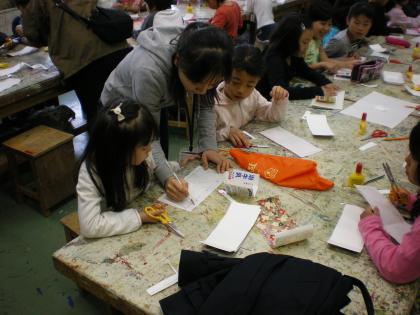 この母の日カードの材料は、なんと牛乳パックです。牛乳パックを切り開き、上から千代紙をはります。とても牛乳パックでできているとは思えないほどの出来ばえ。「難しかったけど、とても楽しかった。自分で使いたい!」。そんな声が挙がるほどの作品でした。