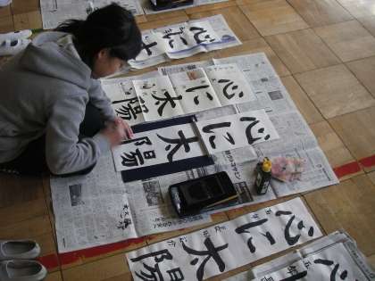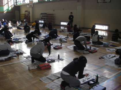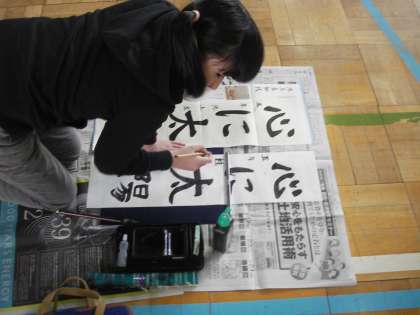 15日、体育館では5年生が書き初めをしていました。「心に太陽」という文字です。