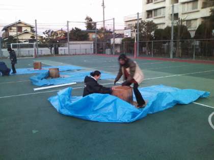 今日はもちつき会です。6時ごろから準備が始まっています。もうかまどに火がはいりました。臼の準備もすすんでいます。