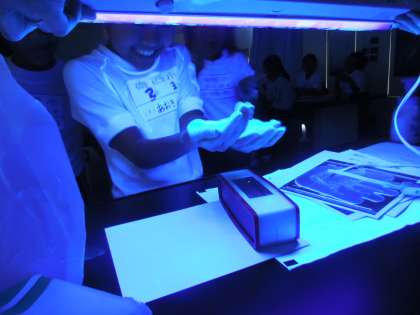 特殊なクリームを手に塗って、手を洗います。その後、理科室を真っ暗にして、ブラックライトで手を照らすと洗い残した汚れが浮かびあがるという実験です。子どもたちは「すごく汚い」「手洗いしたのに」「手の甲とか手首が全然洗えていないんだ」と、普段の手洗いが不十分だということを、実感を伴って理解することができました。授業のまとめでは、保健委員会が作成した、手洗いの歌をおさらいしながらもう一度手をきれいに洗いました。