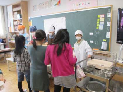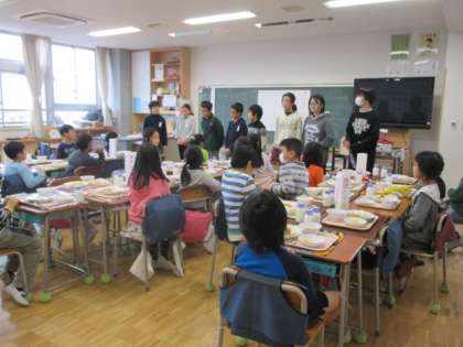 今日は、さくら組のお別れ給食会でした。5年生が、名札やゲームの内容、流れを決め、給食の準備も5年生を中心に行いました。6年生と一緒に「いただきます」をする班もありました。