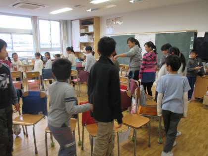 室内遊びも5年生が考えて、椅子取りゲーム、爆弾ゲーム、ハンカチ落とし、フルーツバスケット等々みんなで他の楽しく遊んでいました。