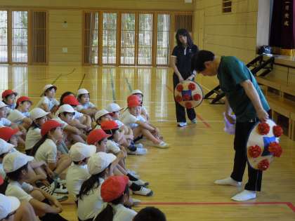 花笠音頭とは、お百姓さんの仕事や生活を踊りで表したものです。1時間目は、”花笠とはどんなものか”について、日常の動きと踊りをクイズで結び付けていき、踊りの基礎を習得しました。2時間目は、実際に笠を使って踊りを行いました。講師の方は、簡単そうに踊りますが、腰を落としたり、腕を伸ばしたりと、かっこよく見せるには、たくさんのポイントがありそうです。