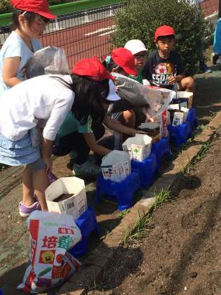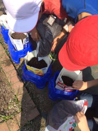ご家庭でご準備いただいた牛乳パックを3枚使用して、鉢に10リットルもの土を入れ、苗を植えました。