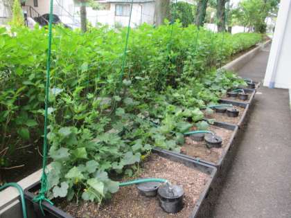蔓の植物を何種類か植えています。大きくなると4階まで日陰になります。エコにも少し取り組んでいます。