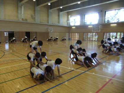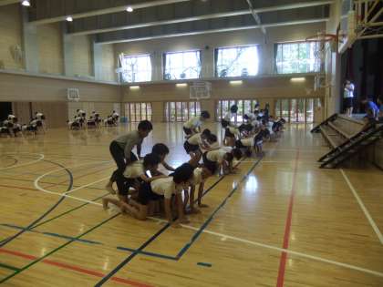 組体操の練習をしました。一通りの技を覚え、これから精度を上げていく段階です。皆、気合い全開でがんばりました。たくましい表情になってきました。