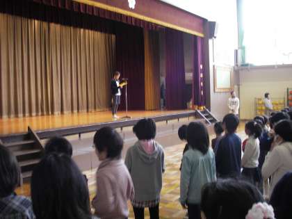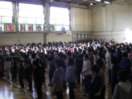 月曜日は全校朝会です。校長は、人格の完成2月のテーマ「やりぬく心」について話しました。頑張っている友達を応援したり、困っている人に励ましの声を送ることこそが大切であるというお話でした。児童会からはユニセフ募金の報告がありました。看護当番の先生からは今週の目標「すみずみまできれいにそうじをしよう」が話されました。