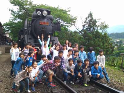 油のにおいが立ちこめる線路の上で記念撮影です。