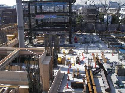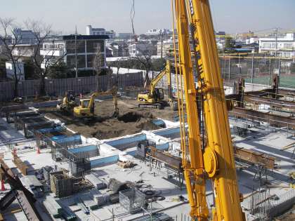 8日段階の工事の状況です。日に日に変化していきます。午前中と午後とでも違ってきています。昇降口の形とか体育館の形がよくわかります。体育館の土台は土を敷き詰めていることがわかります。