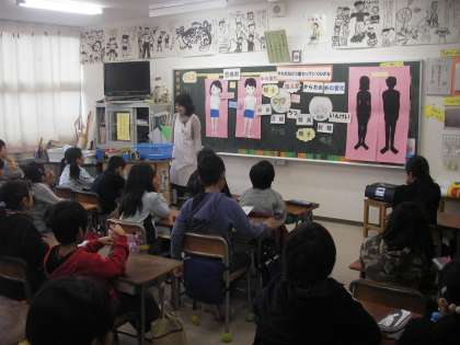 4年生の教室を参観すると植田先生が保健の授業をしていました。「からだはどう変わっていくのだろう」の授業です。誕生から、思春期を迎え、そして大人になっていく間に人間は変化していきます。