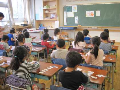 今、1年生の算数の学習では、計算カードを使ってたしざんの学習をしています。計算カードをゲーム形式にして活用すると、子どもたちから「たしざん楽しい」というような声が飛び交いました。今後も計算カードを大いに活用し、子どもたちに「算数は楽しい」ということを実感させることができたらなと思います。