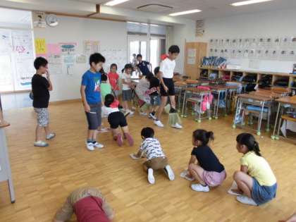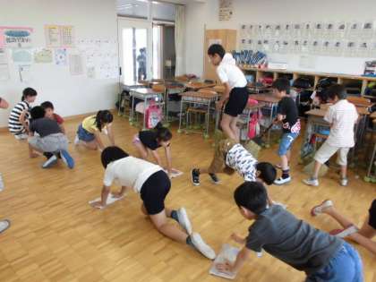 方やもくもく清掃への取り組み方を教えています。特に1年生は、来週から自分たちでの掃除が始まるので、ほうきの使い方やぞうきんのかけ方などを6年生が優しく教えていました。
