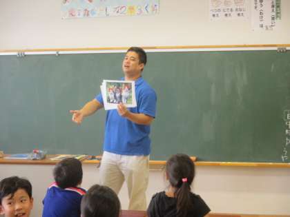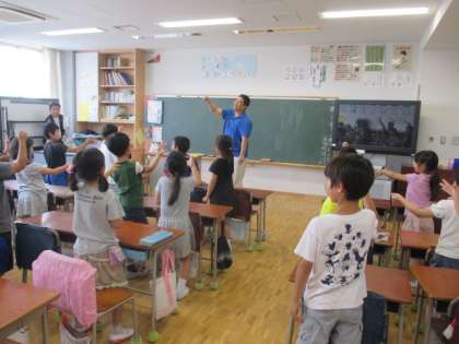 先週から1年〜4年生の英語活動が始まりました。今日は2年生です。子どもたちと先生のじゃんけんから始まります。子どもたちの耳のよさと発音の良さにはびっくりです。