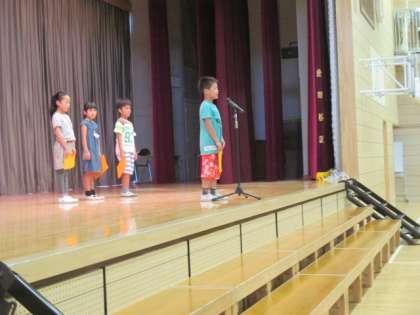 そのあと、児童代表で2年生が1学期の振り返りを発表しました。メモを見ないでしっかり発表していました。