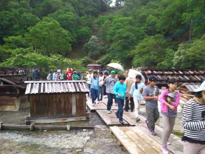湯ノ湖の畔にある湯元温泉の源泉を見学しました。