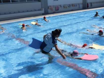 午後は、水泳が苦手な児童を対象とした水泳教室が行われています。副校長先生の指導のもと、顔をつける練習や、ビート板を使ったけのびの練習をしています。