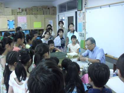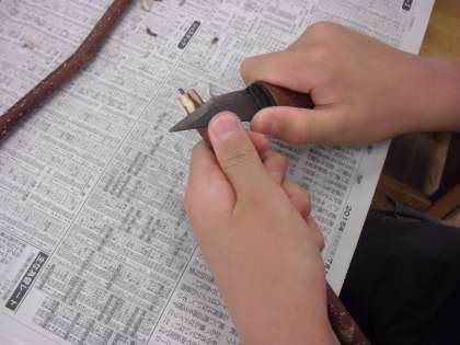 4〜6年生が木のエンピツ作りにチャレンジです。小刀や小さなノコギリを使って木を切ったり、削ったり、根気強く作っていきます。講師は京西小学校の前校長 箭内忠義先生でした。