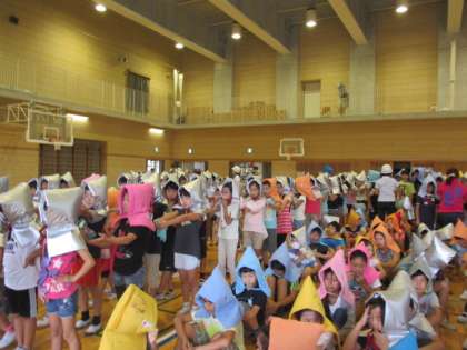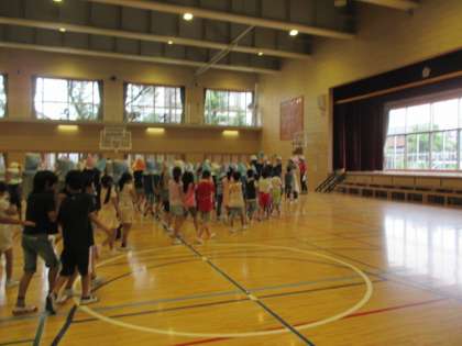 今日は避難訓練でしたが。本来ならば2次避難(火の勢いや煙が多い場合、校庭では危険なので、少し離れたところへ避難する)の予定でしたが、天候が悪く、体育館までの訓練になりました。