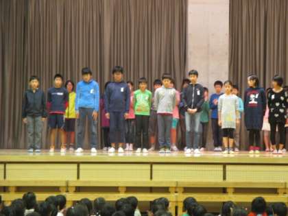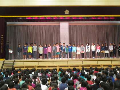今朝の児童朝会では、世田谷区の記録として、2学期はじめの水泳記録会のよい記録を出した6年児童と先月行われて連合運動会でよい記録を出した6年児童の表彰を行いました。それそれの種目でがんばった成果が見えました。