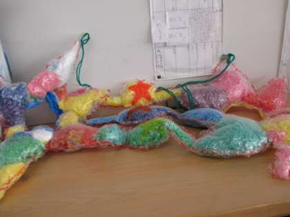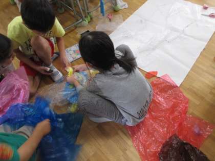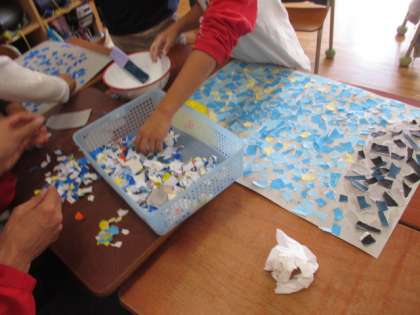1年生から6年生まで、学年の共同作品の製作が始まっています。どの学年も楽しそうな作品です。今日は、3年生と4年生の製作の様子です。