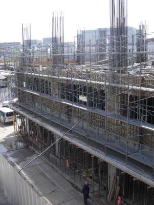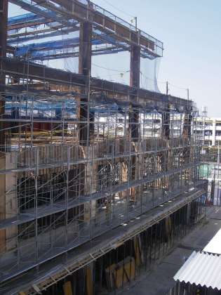 4月9日現在の工事の状況です。今は3階部分の工事となっています。仮設校舎からのカメラでは全体がおさまらなくなりました。
