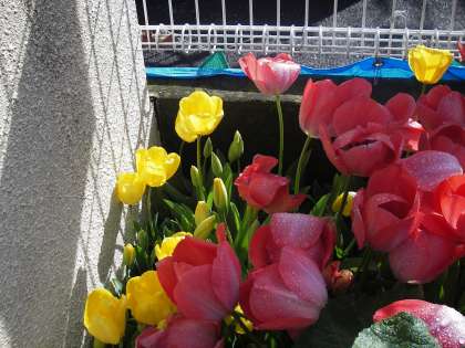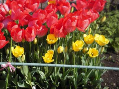 チューリップは赤だけではありませんでした。赤いチューリップの隙間から黄色のチューリップが次は私の番だというように伸びてきています。頑張れ黄色のチューリップ。