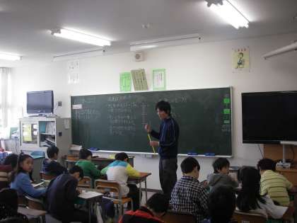 新学期が始まりました。各教室はどんな様子なのでしょうか。4年1組をちらりとのぞいてみました。鳥居晋作先生です。晋作という名は、高杉晋作からご両親が選びつけてくれたそうです。
