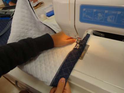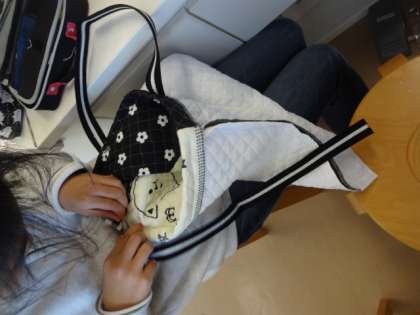 使う用途を考えて、ナップザックかトートバッグの製作をしています。手縫いやミシン縫いの復習をしながら、一生懸命取り組んでいます。